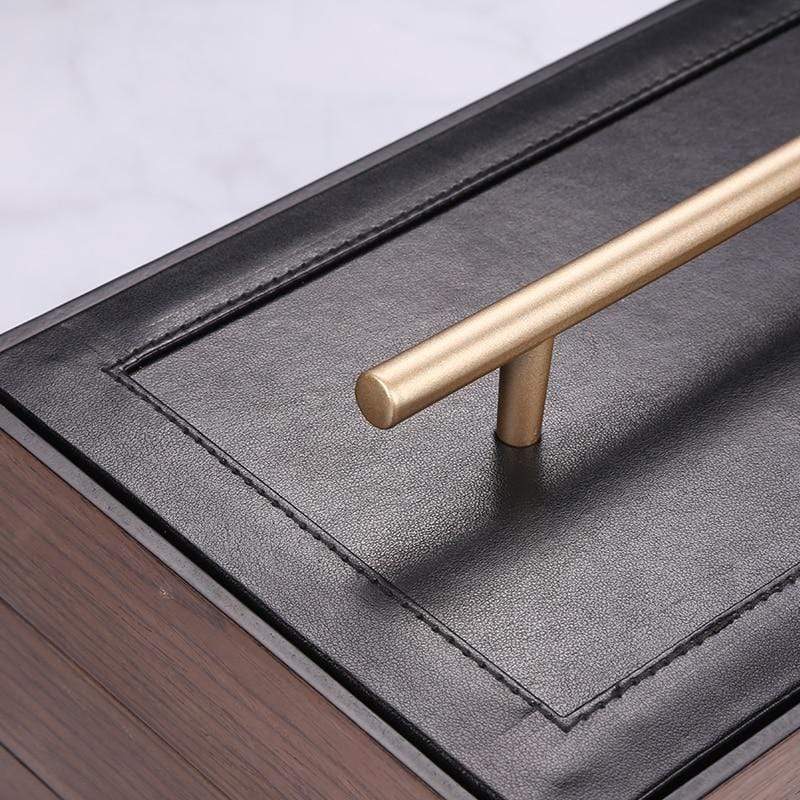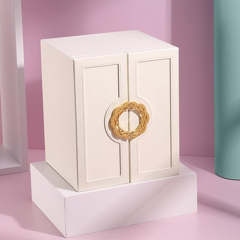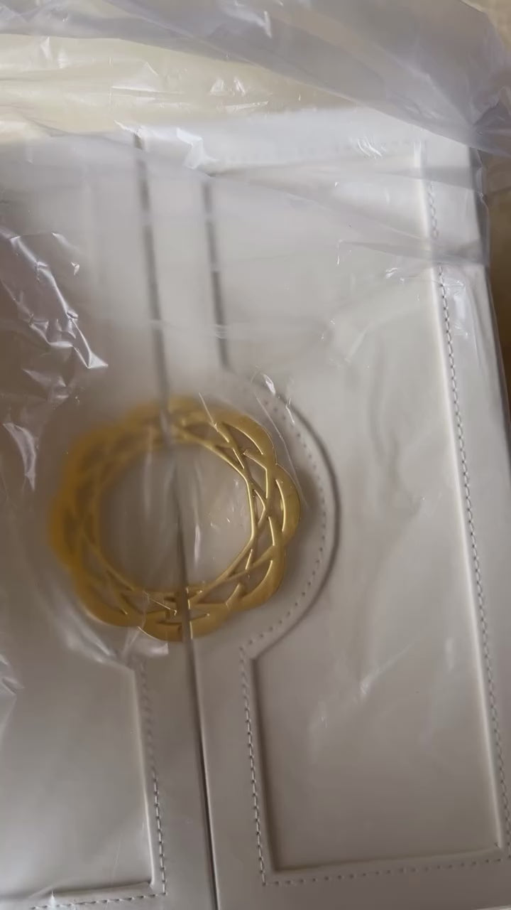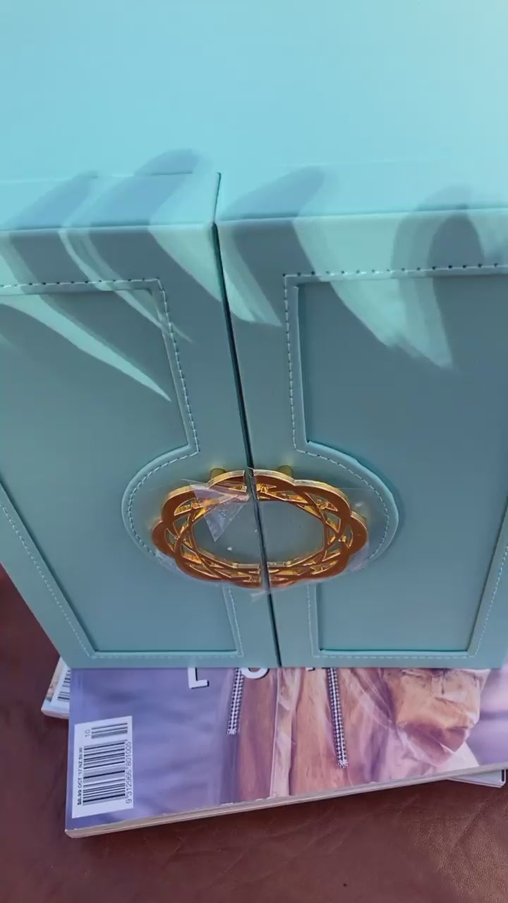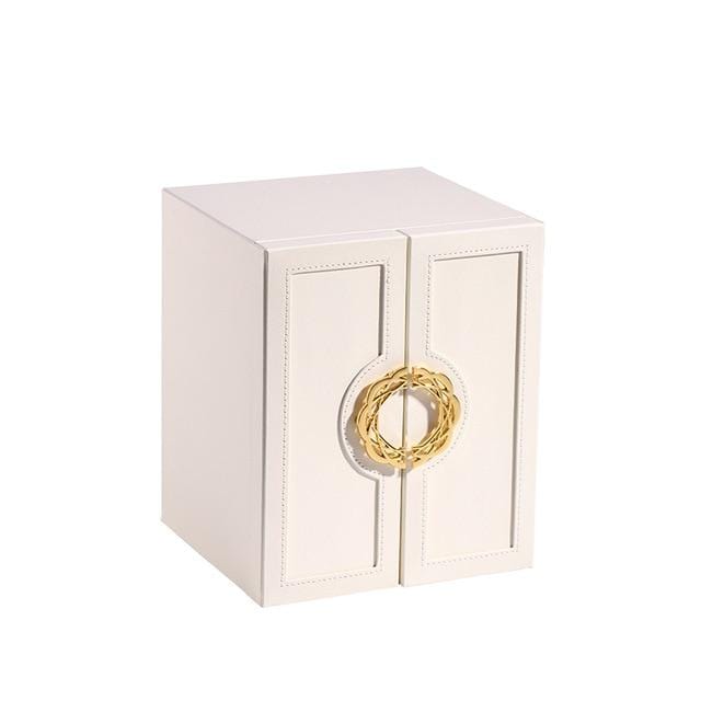 This wardrobe-inspired jewellery box is crafted from smooth vegan leather with refined stitching and a sculptural gold wreath handle. A timeless design that turns everyday organisation into a little moment of beauty.
