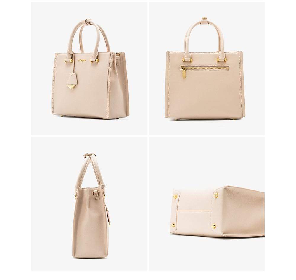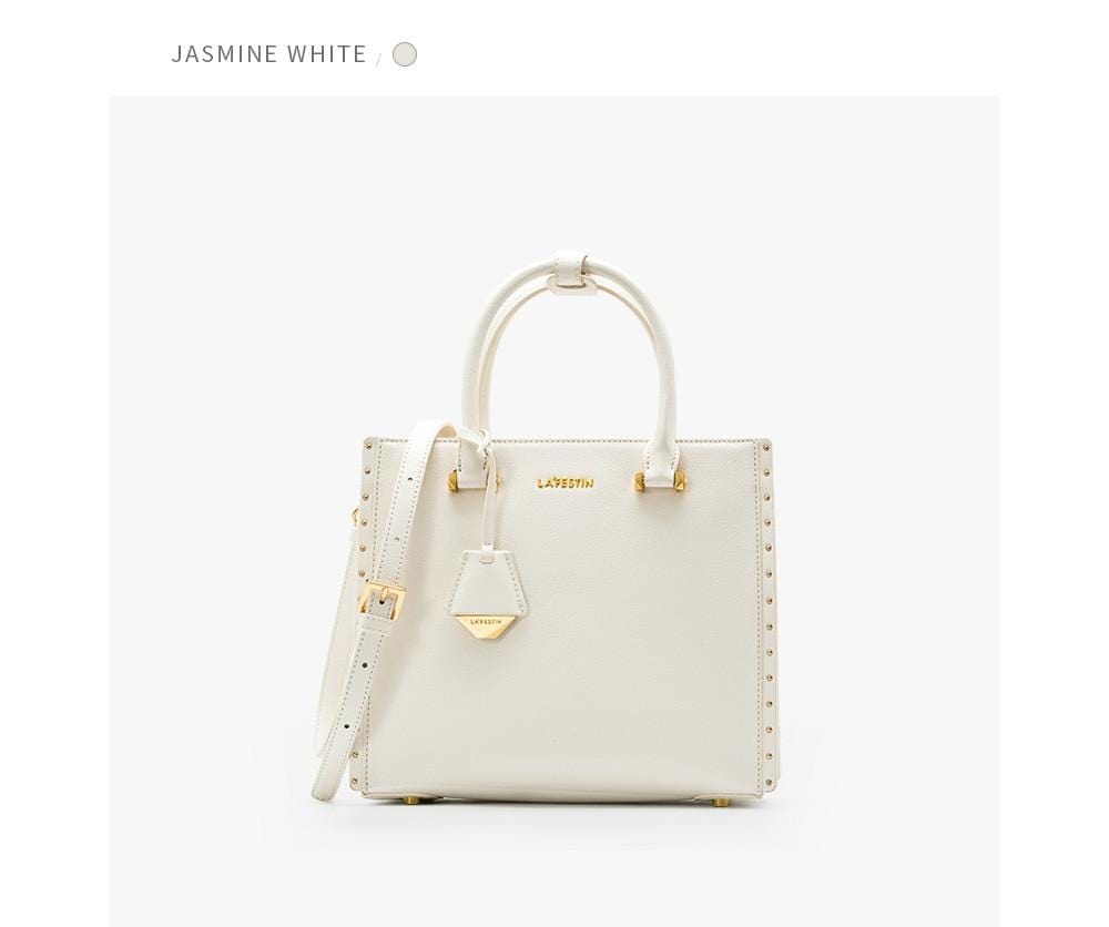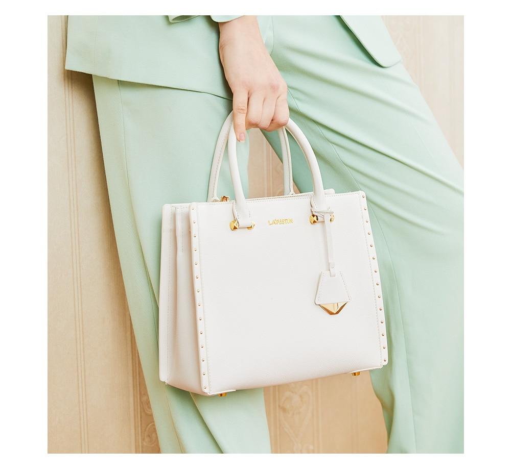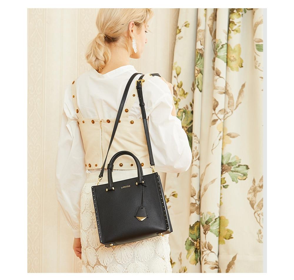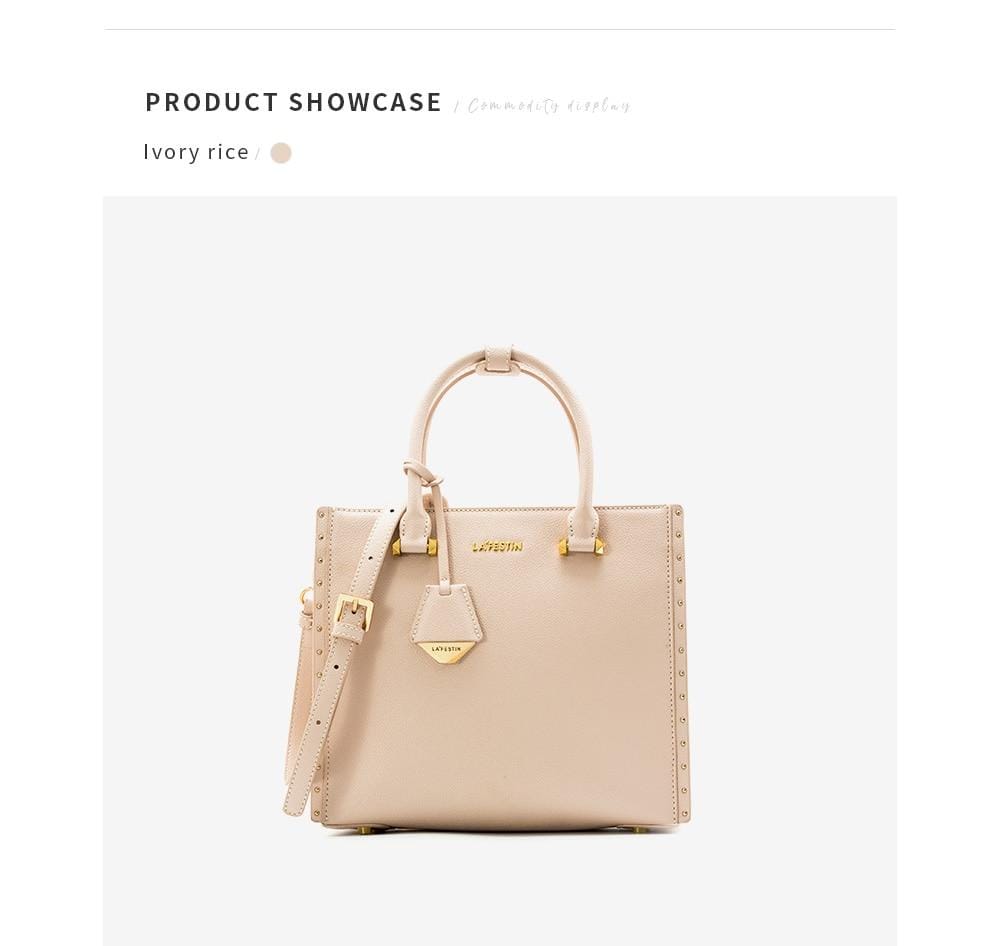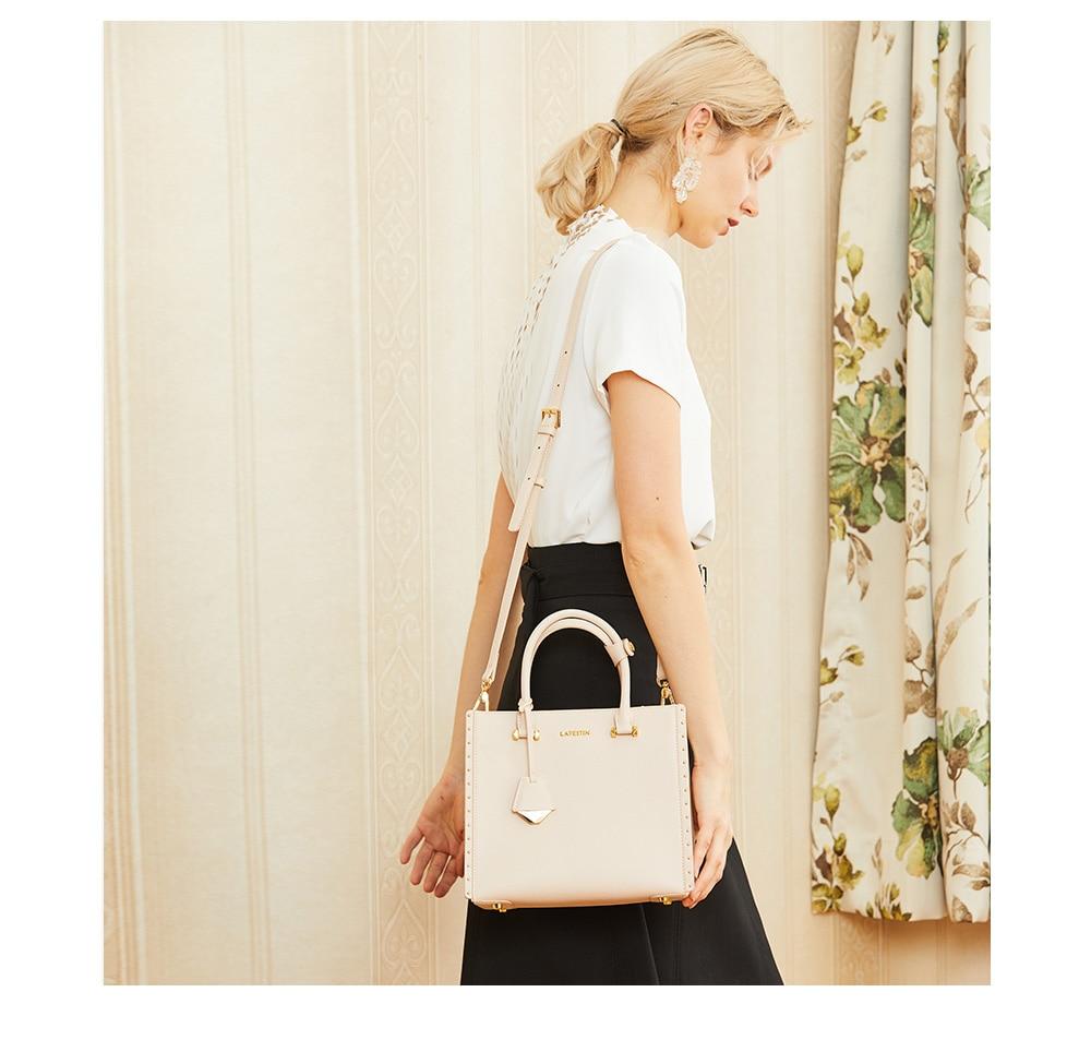 Feminine and elegant lightweight luxury top handle bag, with small bright gold rivets, studded and neatly down on both sides. Offers an insert pocket and a compartment inside with enough space for you to pack your phones, tissue, sunglasses, cosmetics, and some other small stuff, very daily-friendly and practical.