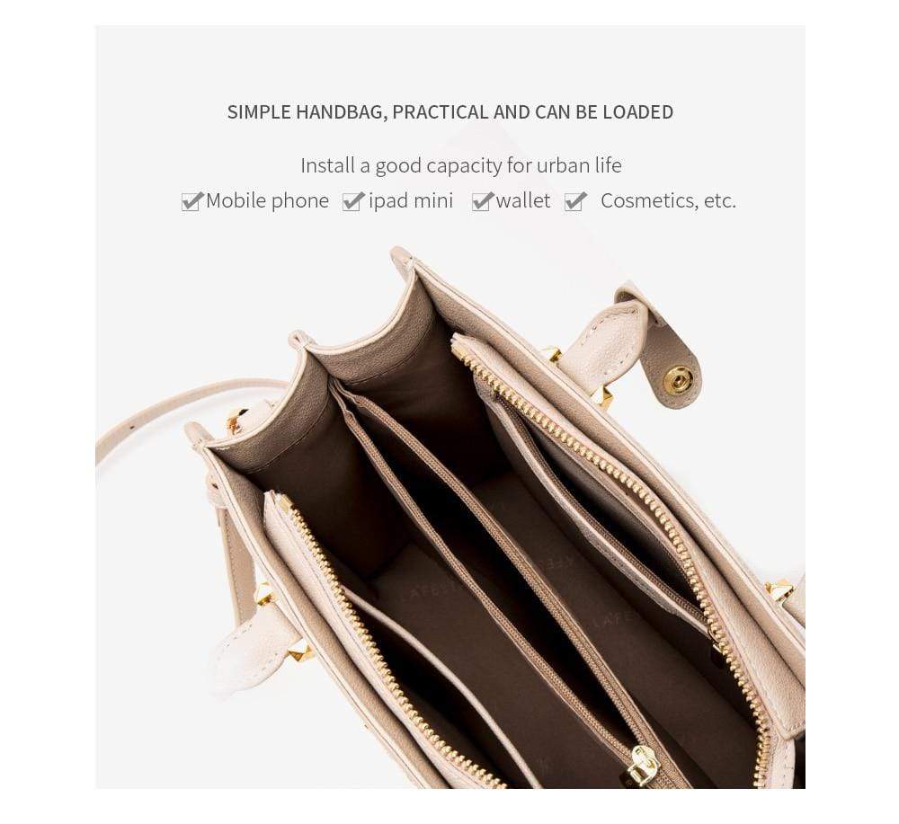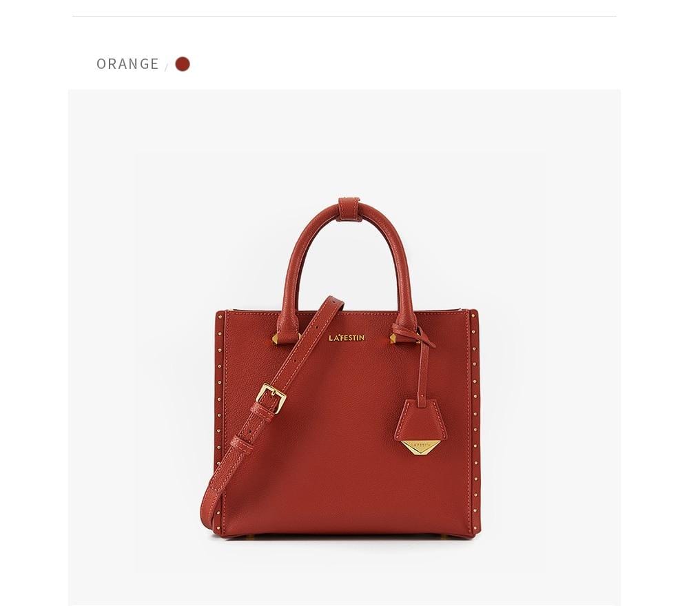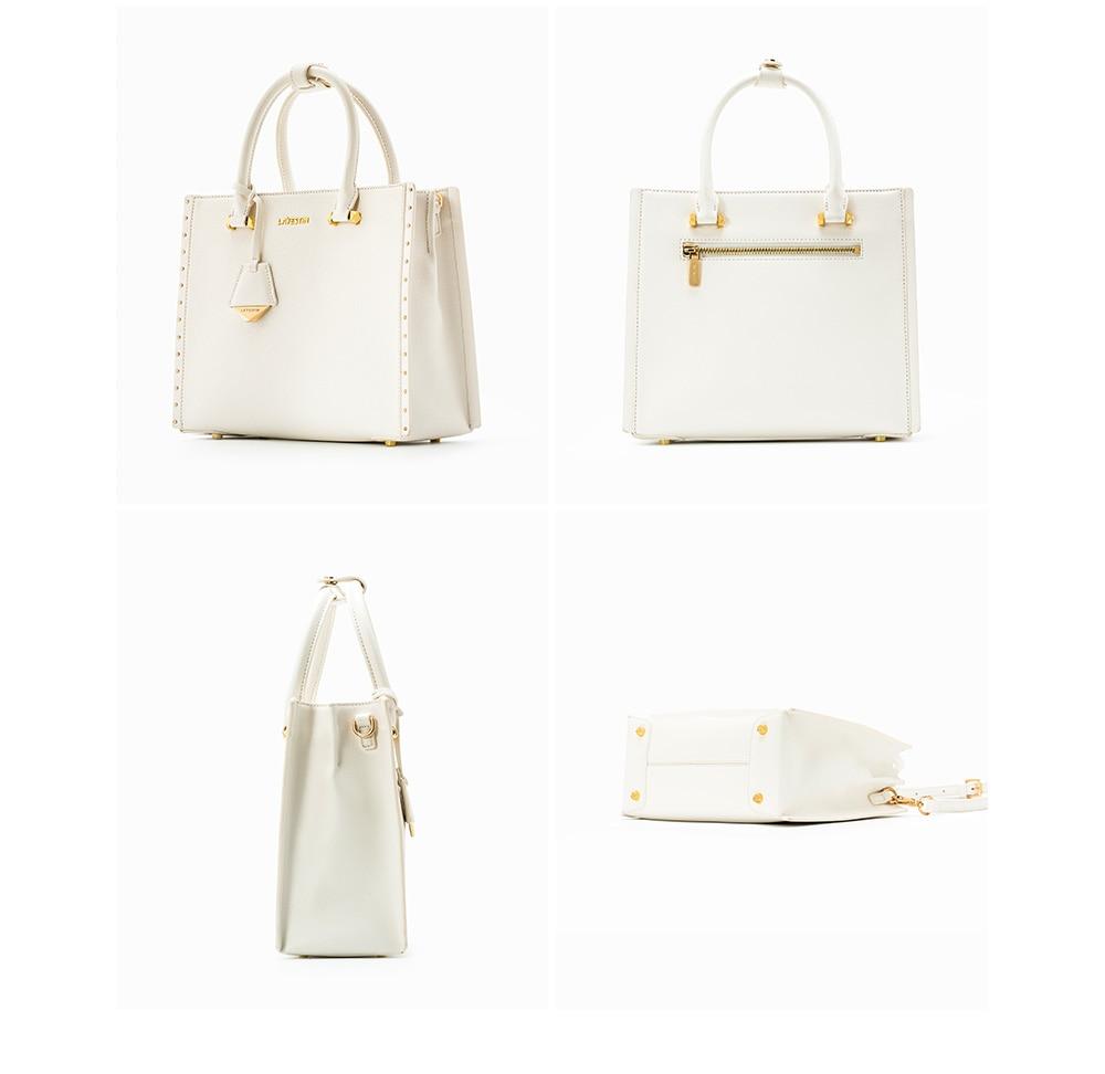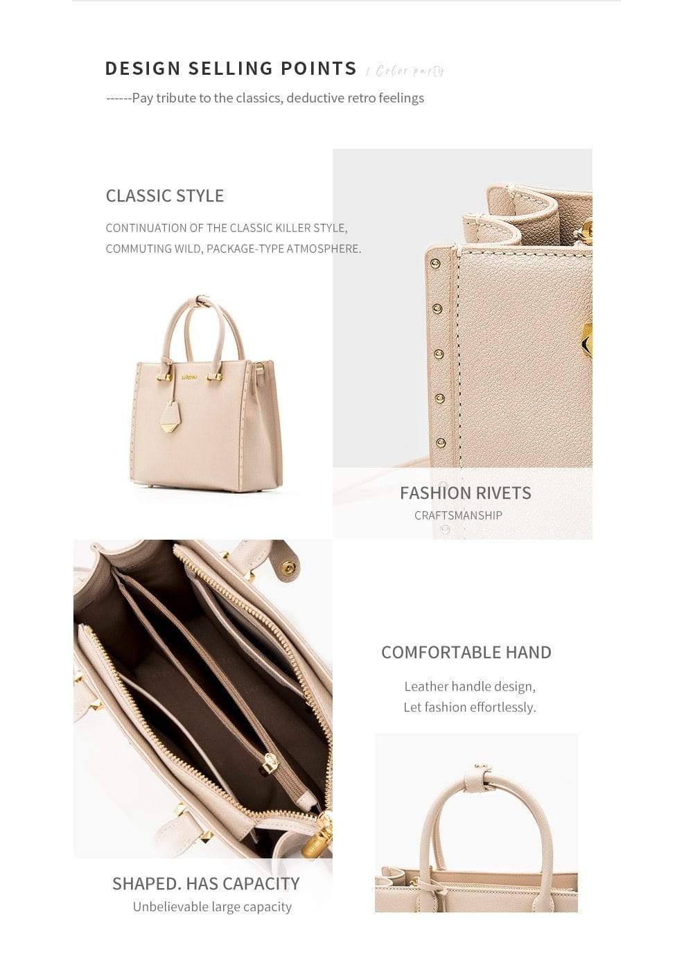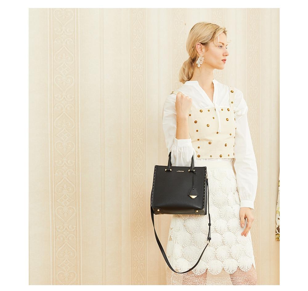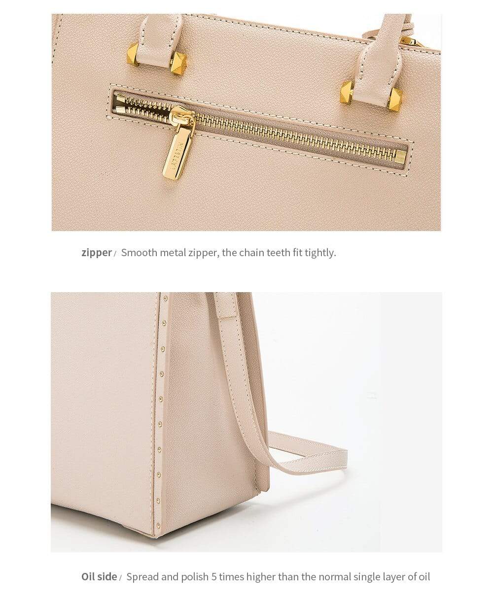 Feminine and elegant lightweight luxury top handle bag, with small bright gold rivets, studded and neatly down on both sides. Offers an insert pocket and a compartment inside with enough space for you to pack your phones, tissue, sunglasses, cosmetics, and some other small stuff, very daily-friendly and practical.