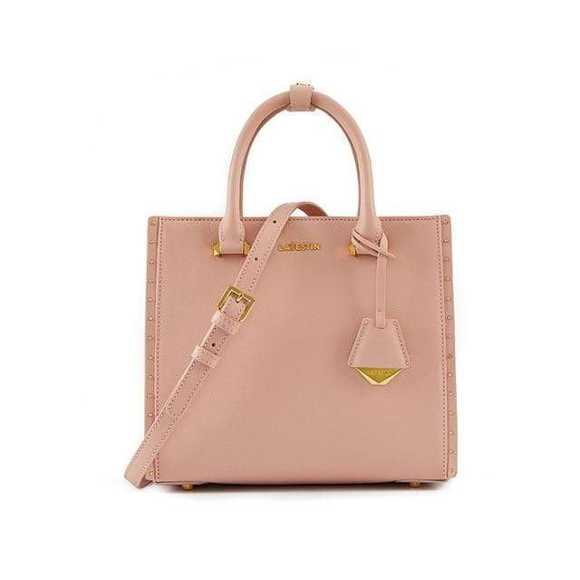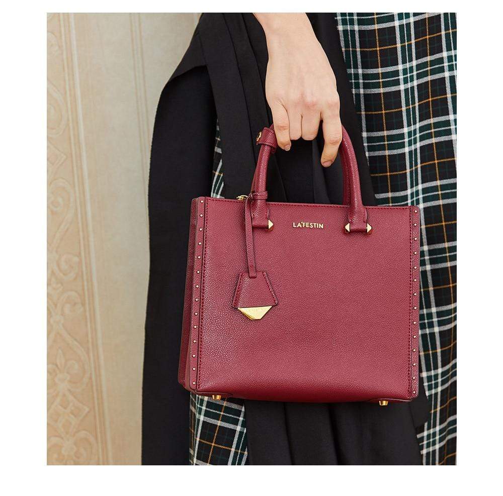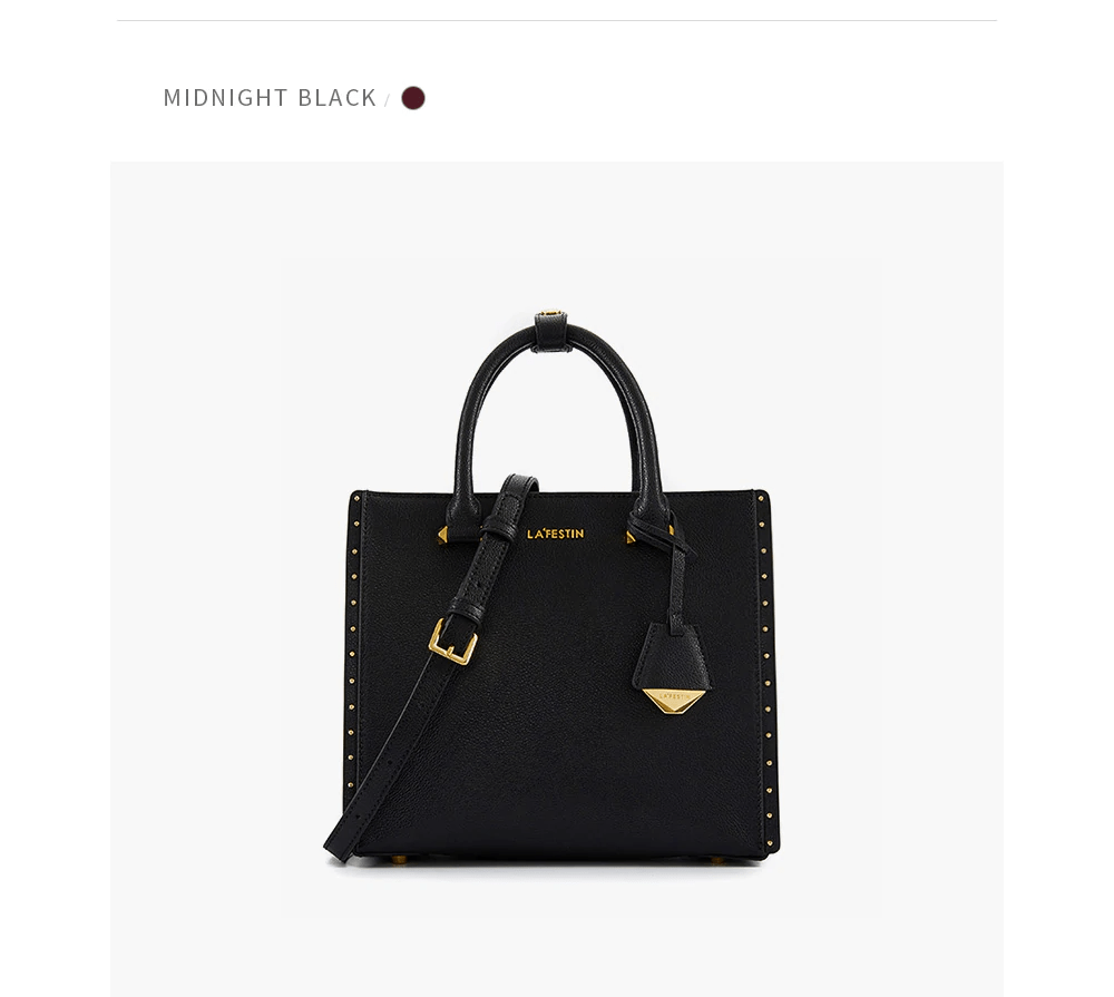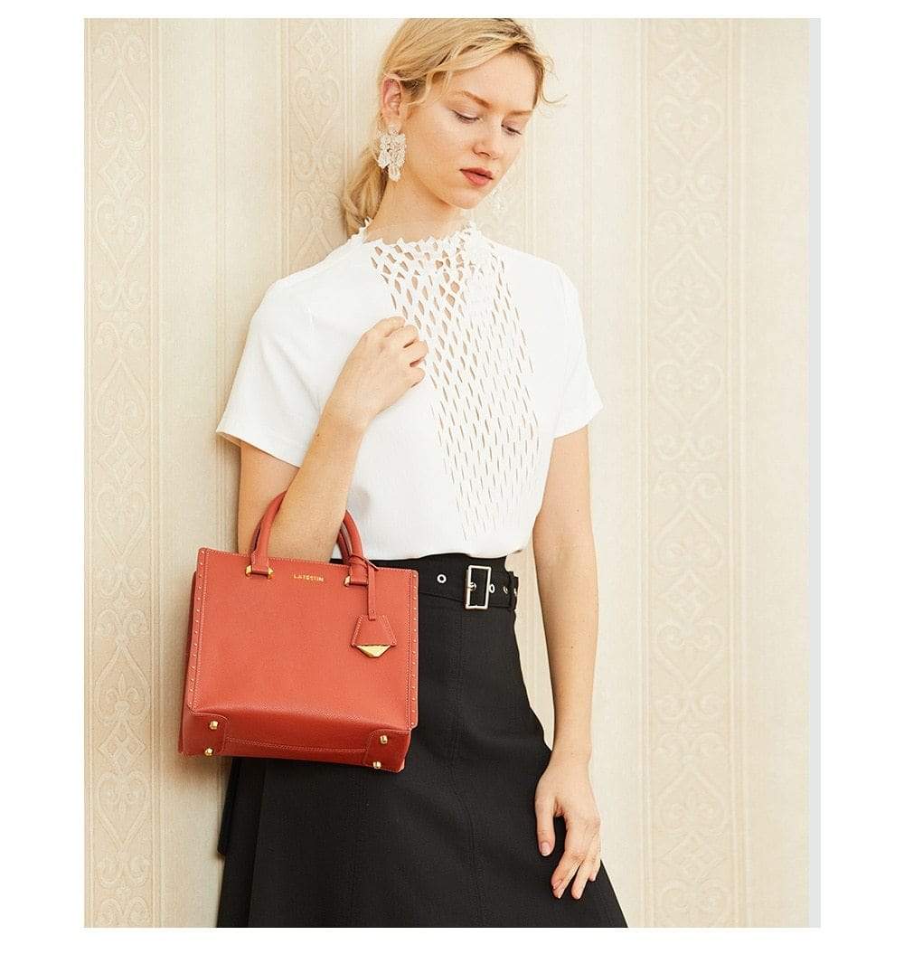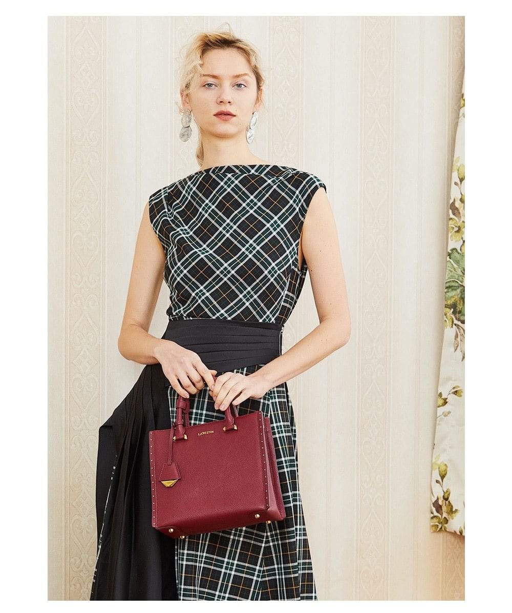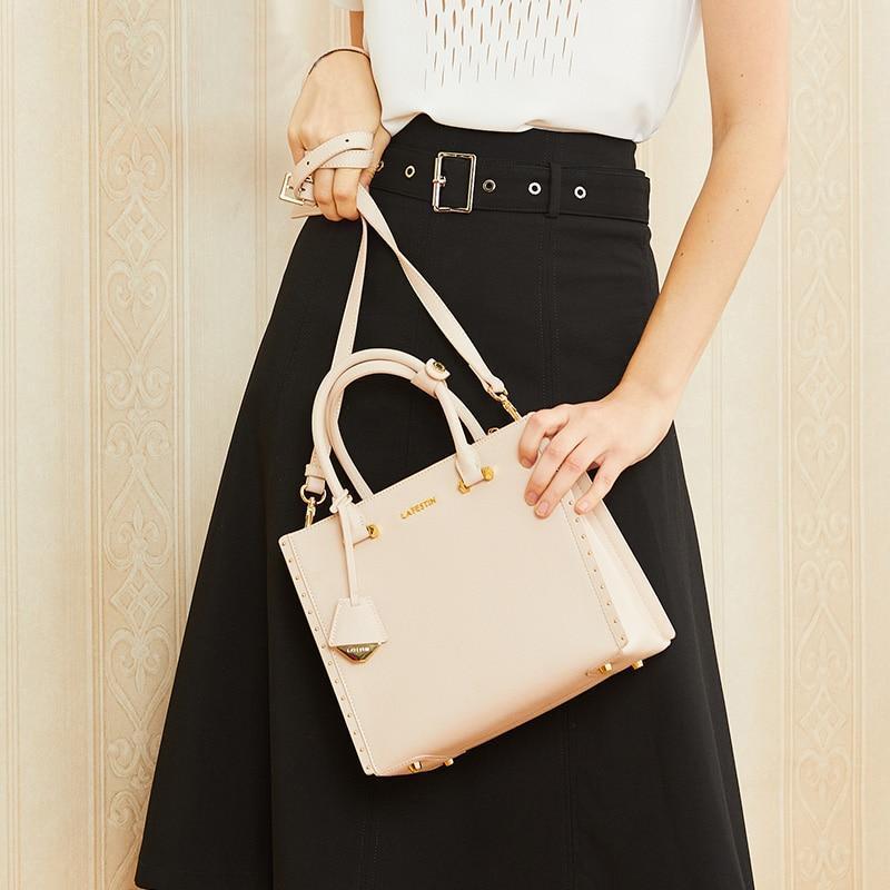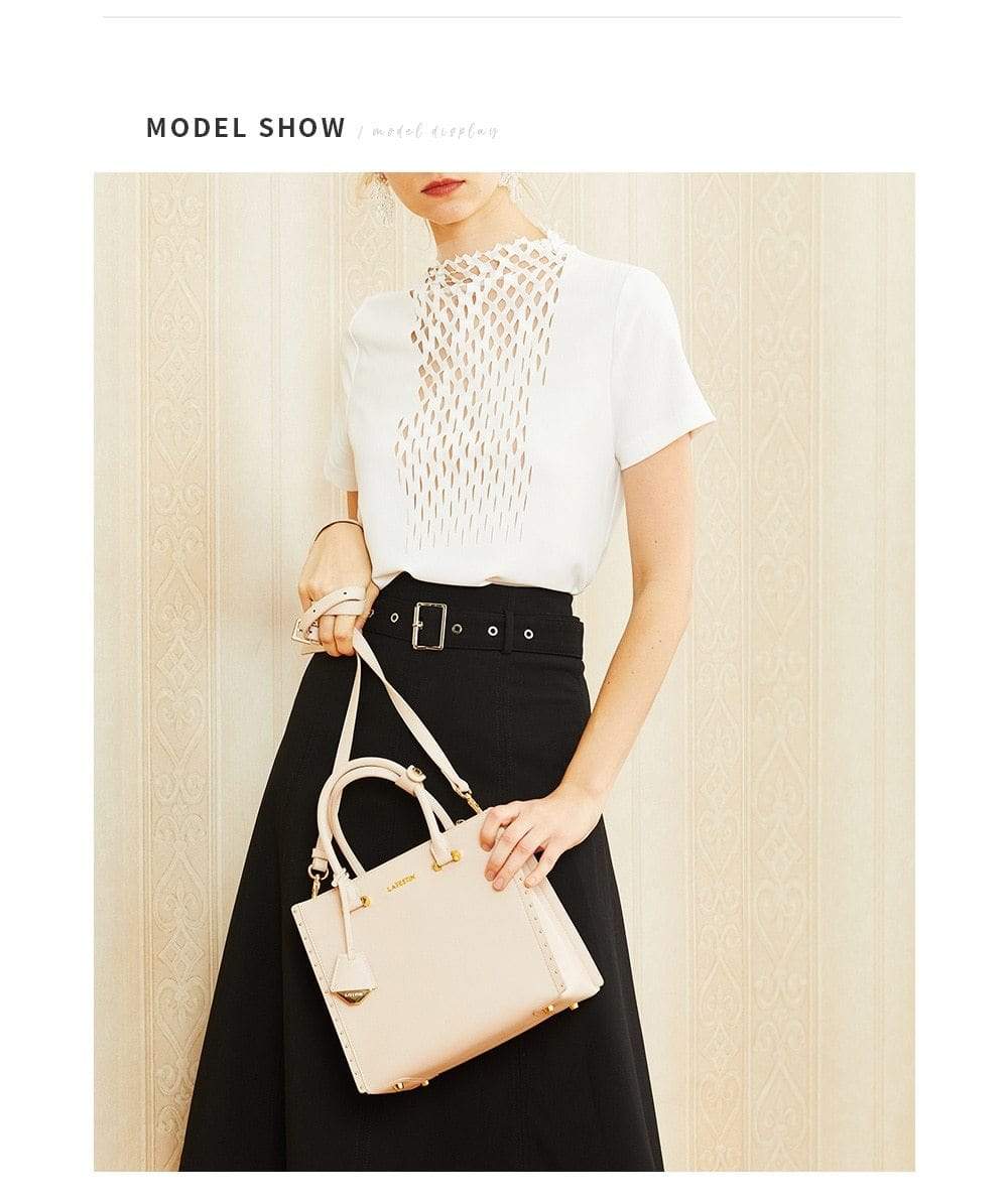 Feminine and elegant lightweight luxury top handle bag, with small bright gold rivets, studded and neatly down on both sides. Offers an insert pocket and a compartment inside with enough space for you to pack your phones, tissue, sunglasses, cosmetics, and some other small stuff, very daily-friendly and practical.