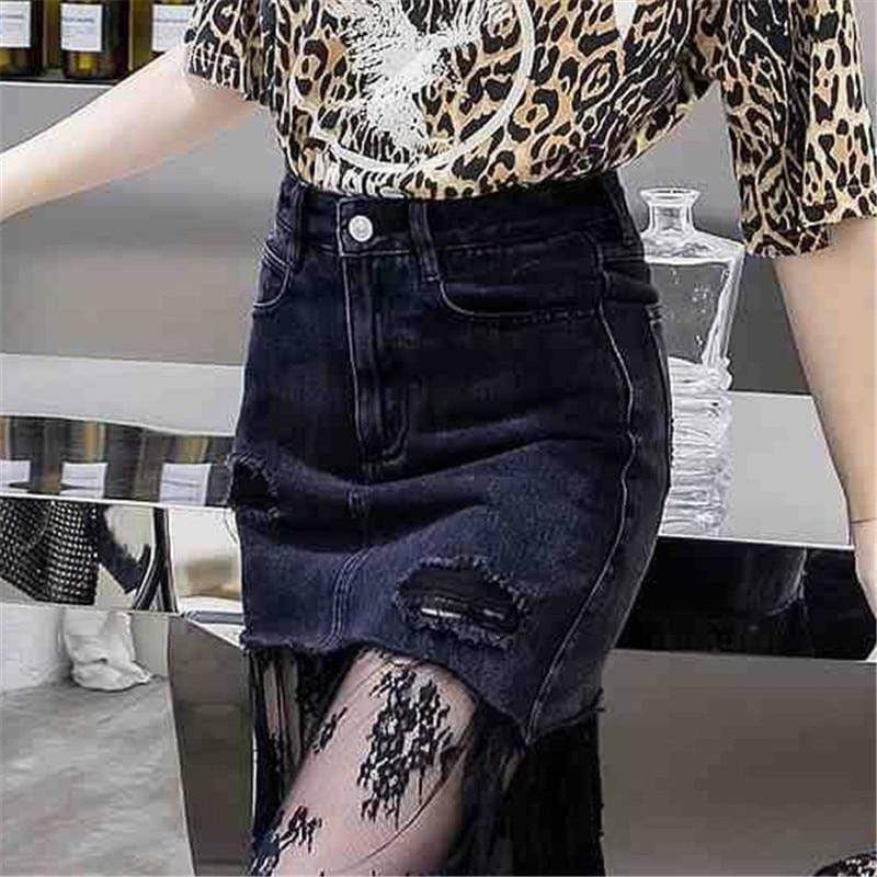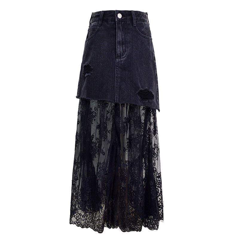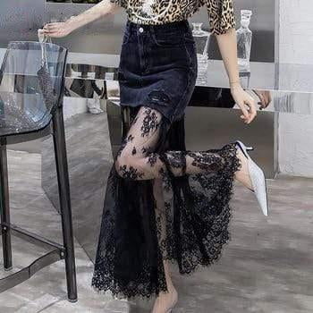 Beautiful denim skirt with a lace hem. Let those legs shine through in a demure yet sultry way. A versatile skirt that you can partner with you signature sneaker and heels.