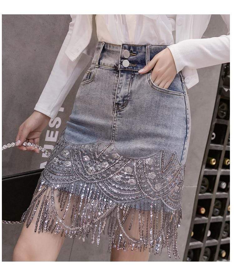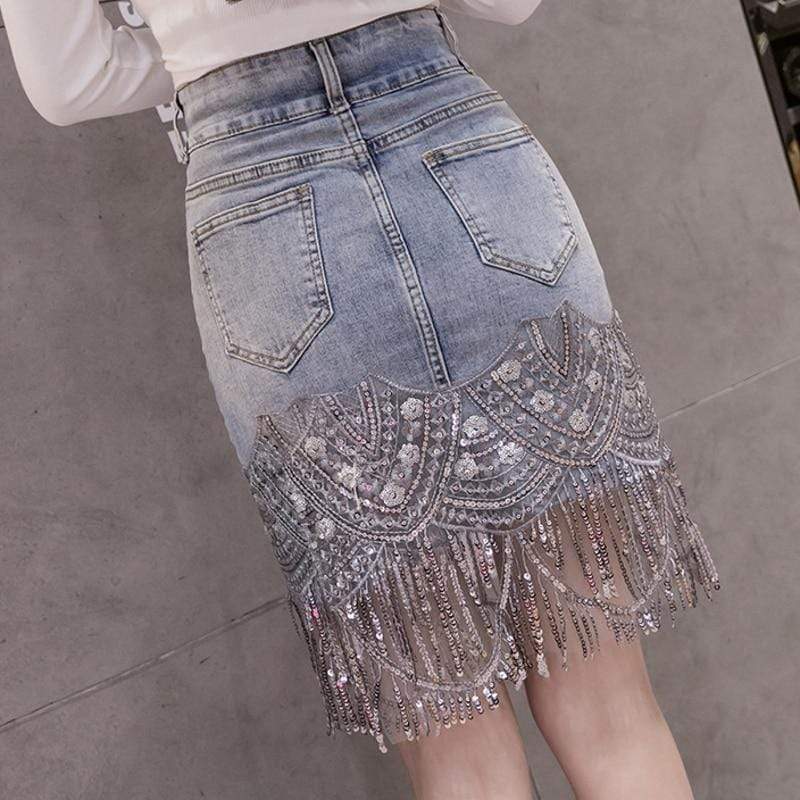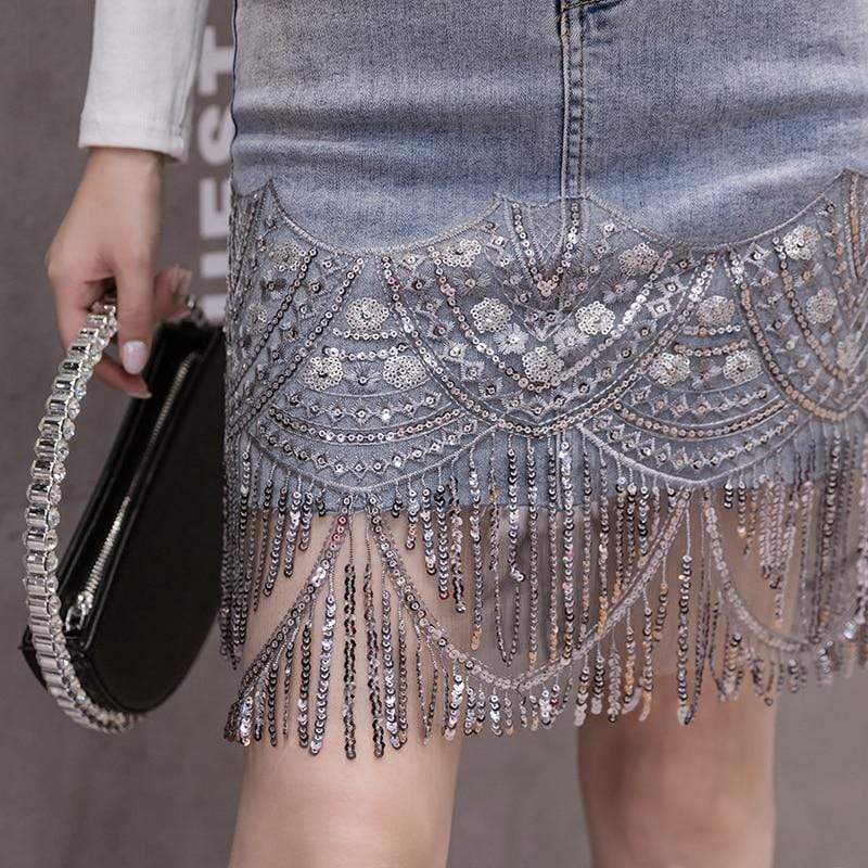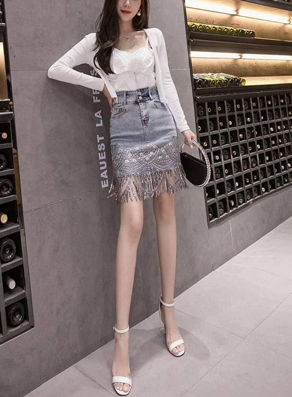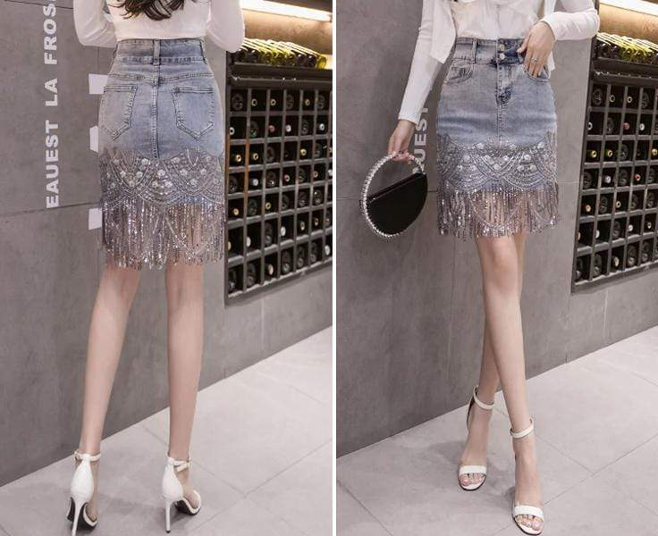Incredibly chic 'Eyes on You Beaded Denim' mini skirt is made from beautifully intricate panels of embroidery and beads. Each tier is trimmed with delicate silver beads and sequins while the high waist waistband ensures a comfortable fit. Wear yours with strappy sandals while coordinating it with a white shirt. Or throw on a pair of cute white heels to complete the look.