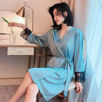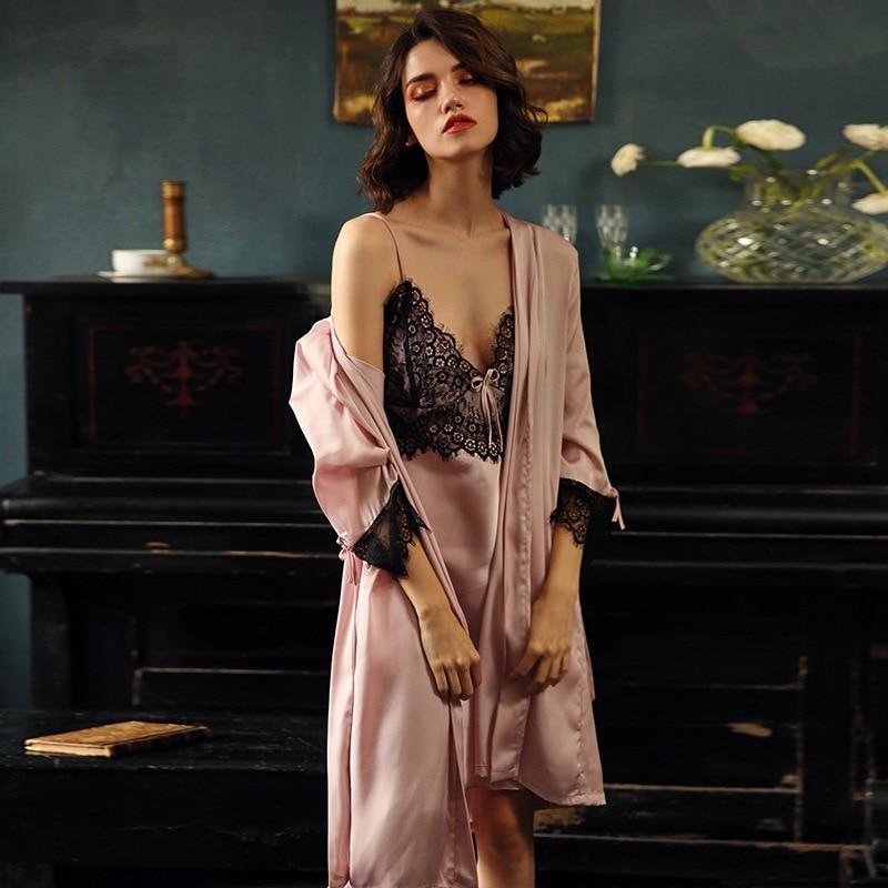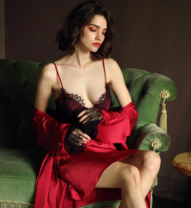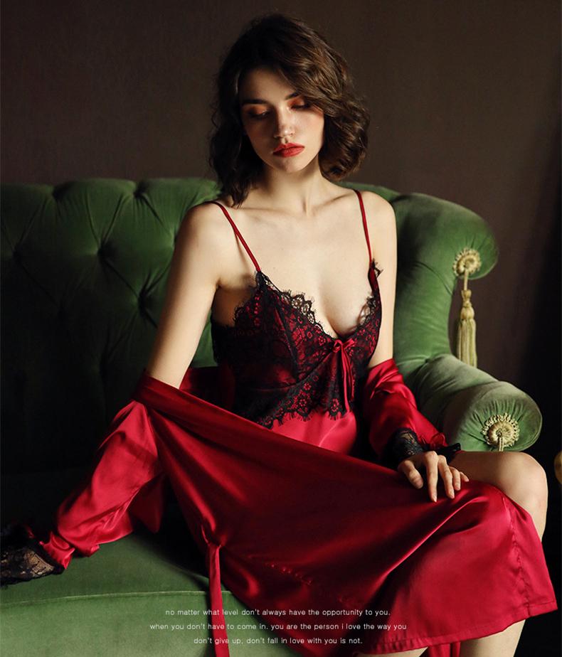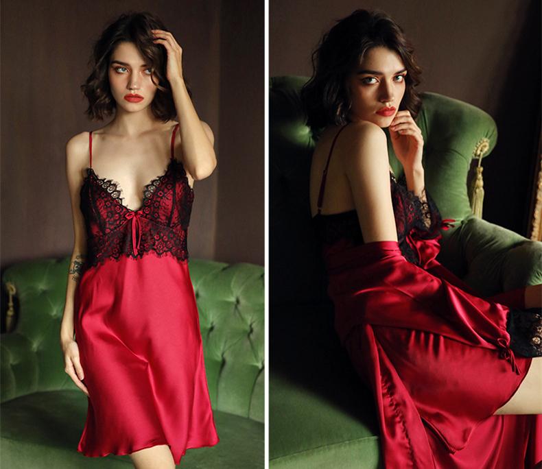 Sexy satin silk sleepwear lace babydoll nightwear features a deep v neck, lace patchwork at neckline, side and hemline, thin shoulder straps, and special unique lace halter neck.