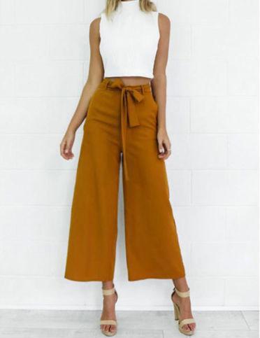 Our 'Soldier on pants' will look so elegant with a blouse or cardigan. Cut from soft material twill in a wide-leg silhouette, they have a long belt that draws attention to the high waist bow tie. The cropped length will work well with mules and sneakers.