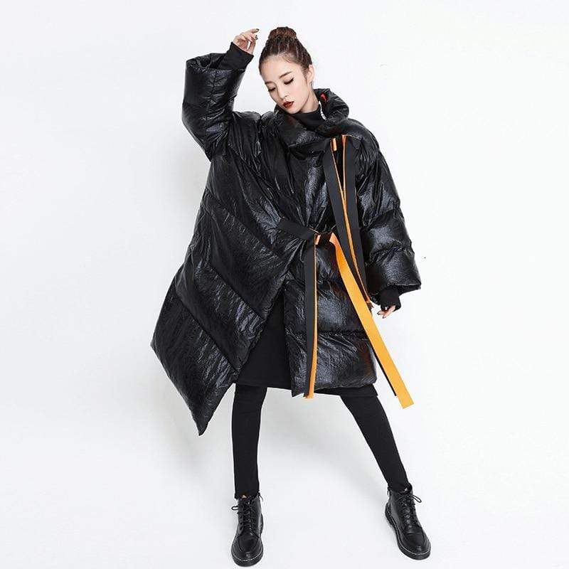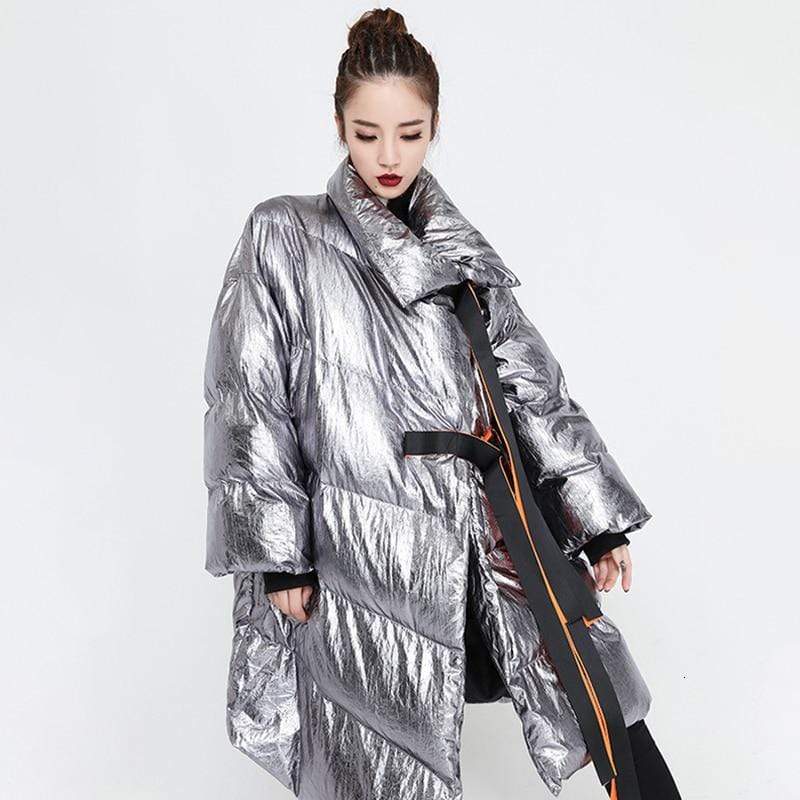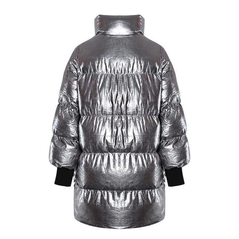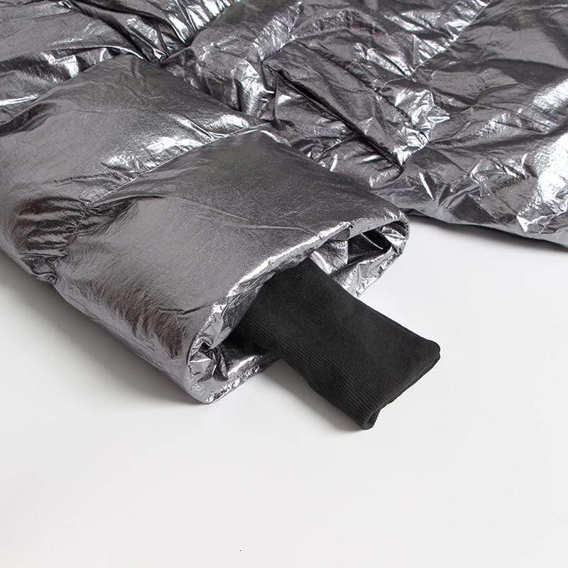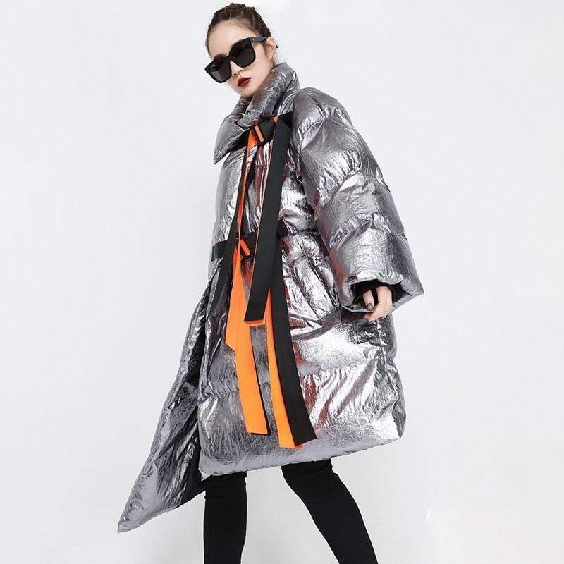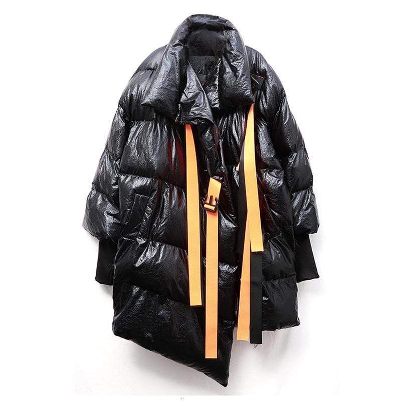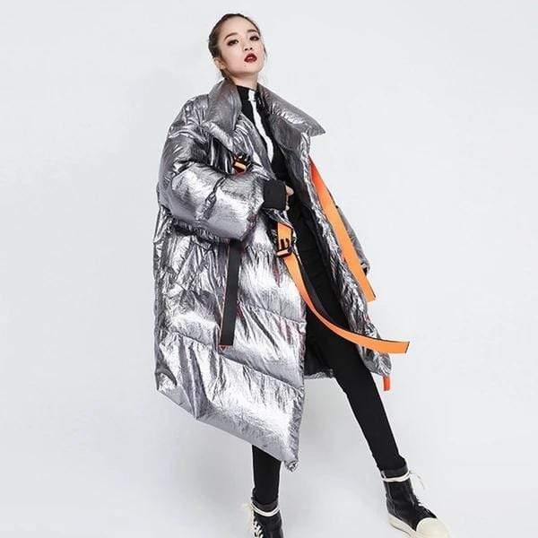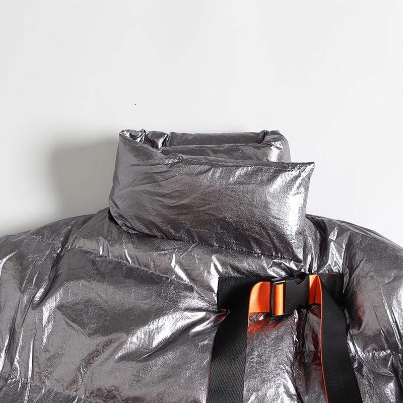 Street style puffer jacket is perfect from beginning to end, this puffer jacket will make you stand out every time. Made in a highly unique metallic water resistant fabric this ultra cool puffer jacket is the epitome of high fashion meets streetwear. Features a contrast orange belt and knit cuffs.