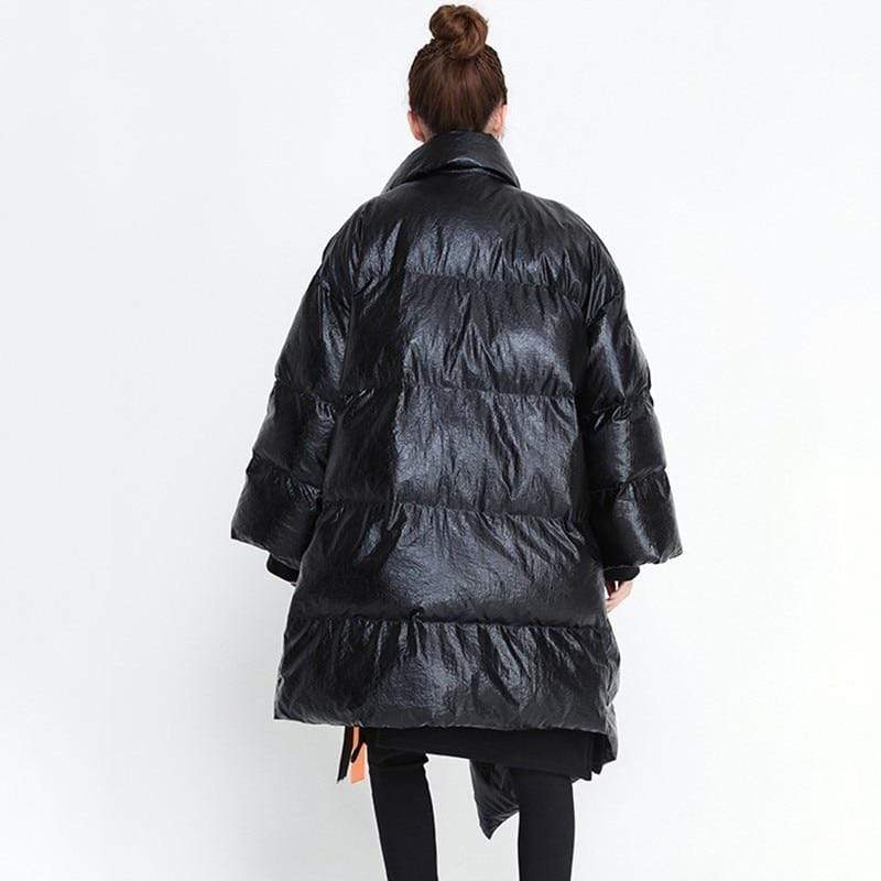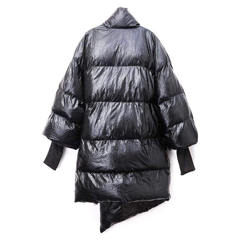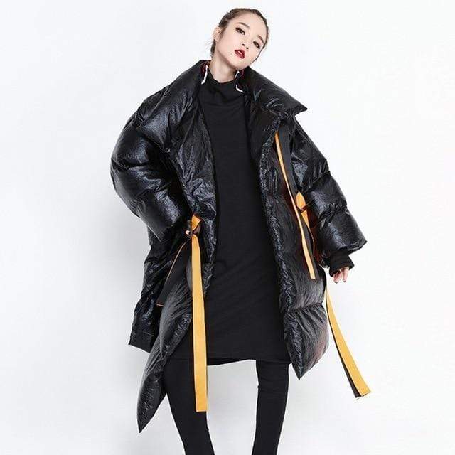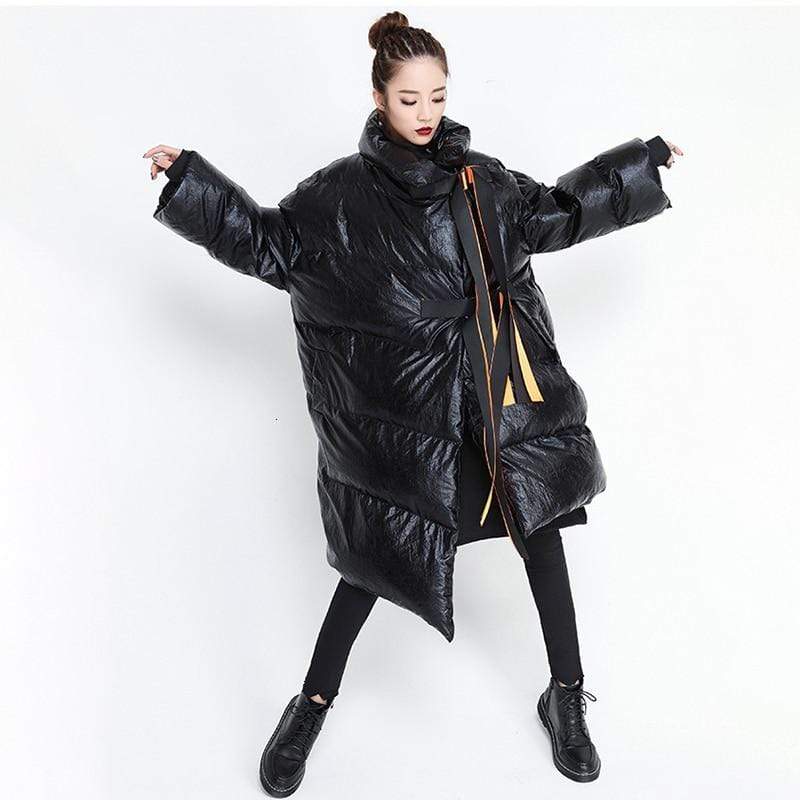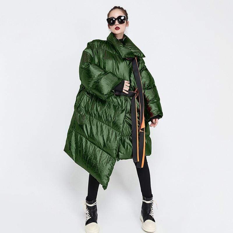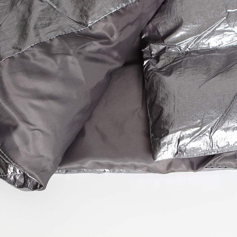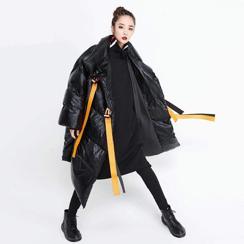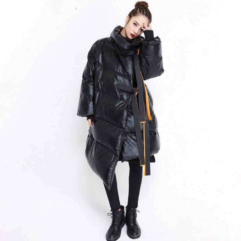 Street style puffer jacket is perfect from beginning to end, this puffer jacket will make you stand out every time. Made in a highly unique metallic water resistant fabric this ultra cool puffer jacket is the epitome of high fashion meets streetwear. Features a contrast orange belt and knit cuffs.