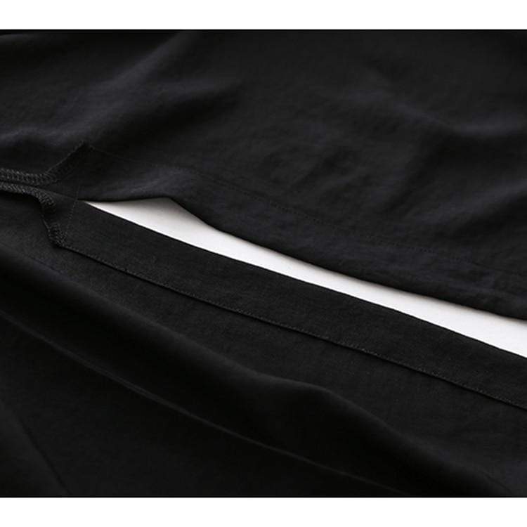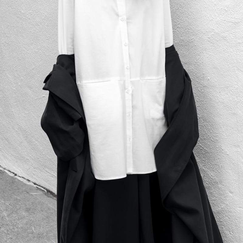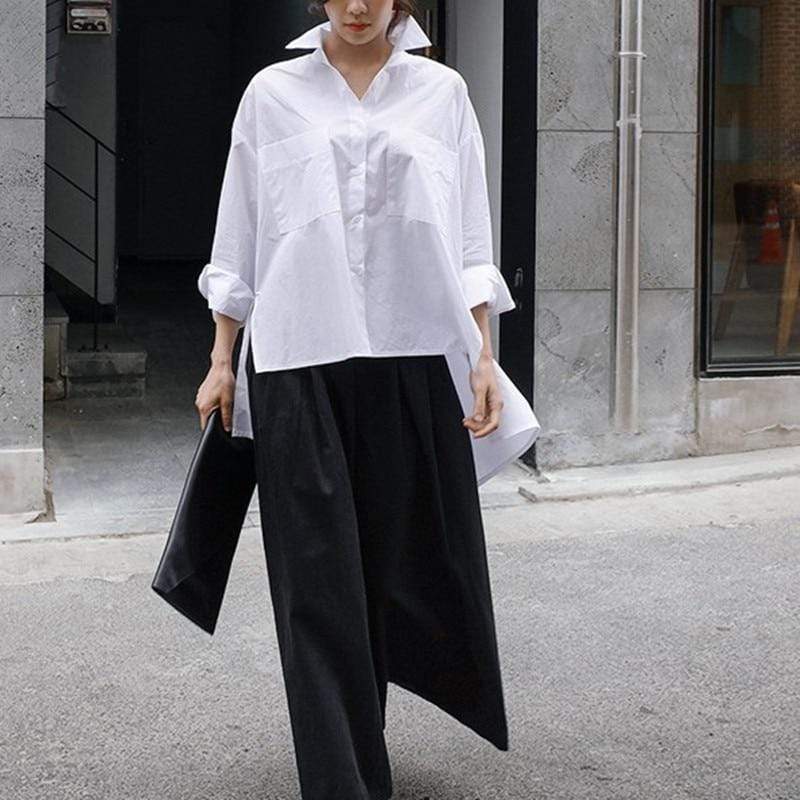 Big shirt with a twist. This size runs small, purchase in a larger size to get the full effect. Pair with a pair of black loose cullottes. Worn here with sleeves rolled up.