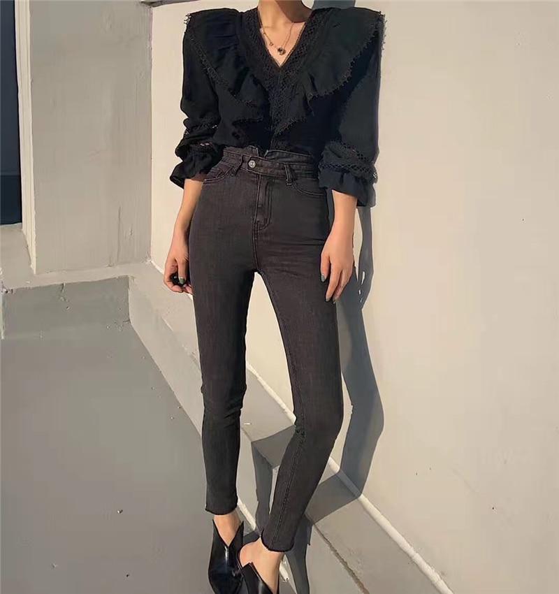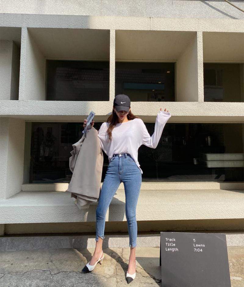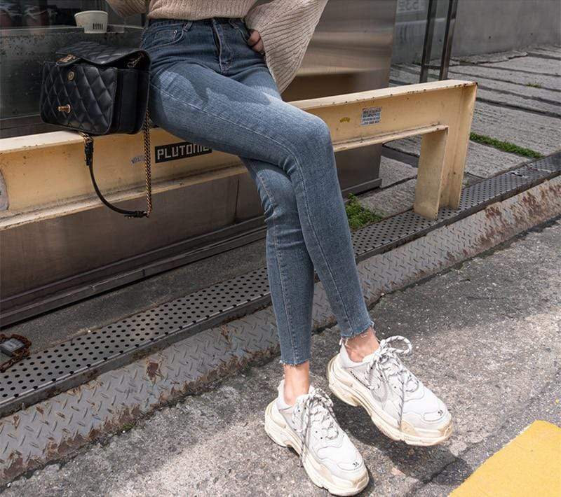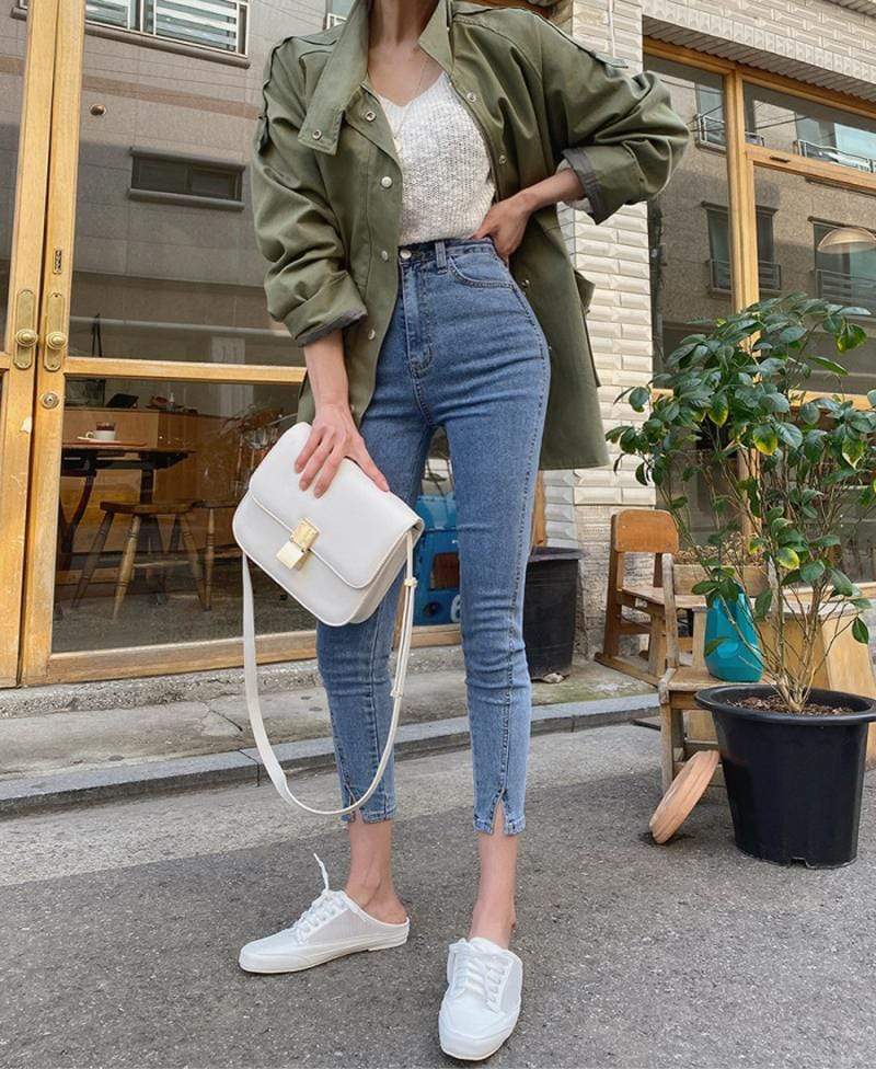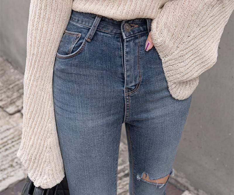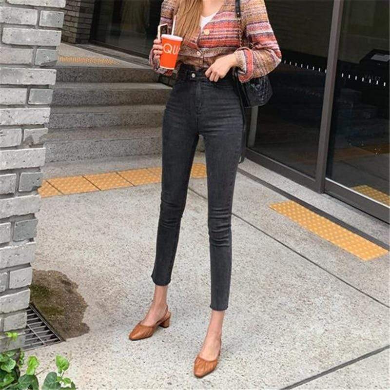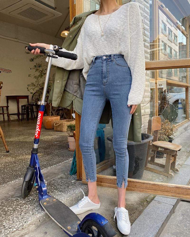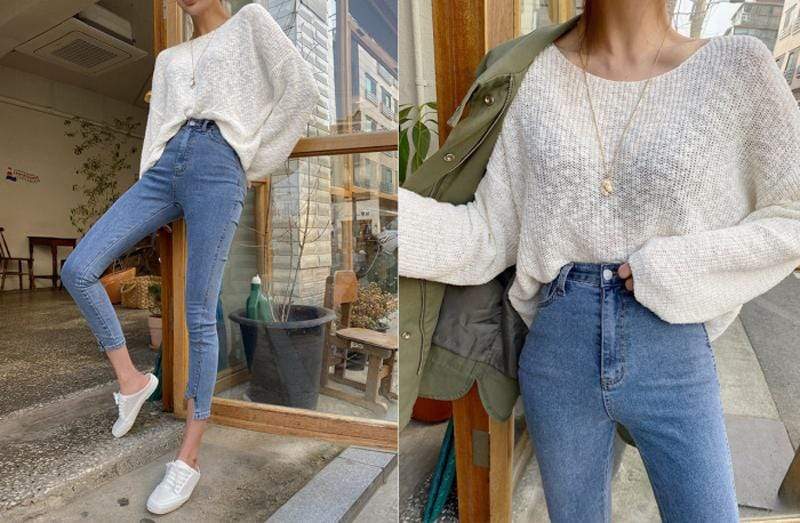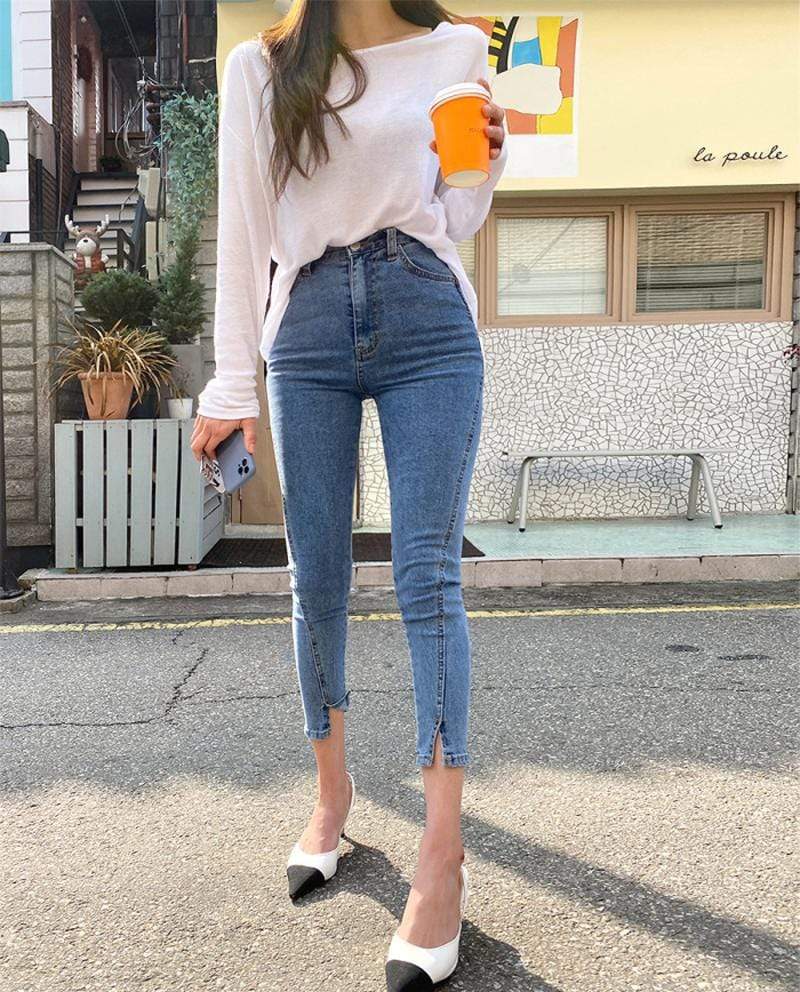 High waisted, cropped skinny denim jeans - perfect with heels or flats. Features slimming side seams that are brought slightly forward and curves down front of shins into an ankle slit opening.