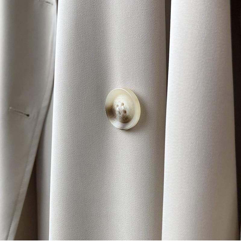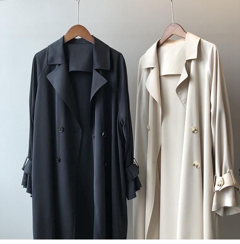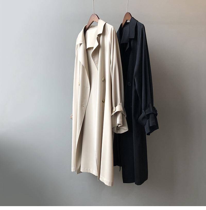Classic double breasted trench coat with contrast piping. Perfect for trans-seasonal weather. Features patch pockets in a light to medium weight coating fabric.